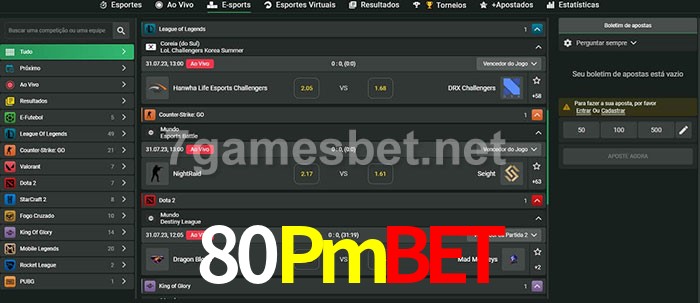 O 80Pmbet oferece uma grande seleção de opções de apostas em e-sports com probabilidades competitivas